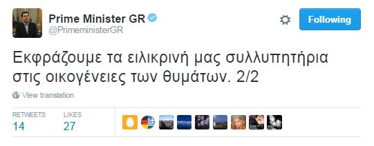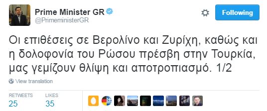 “Οι επιθέσεις σε Βερολίνο και Ζυρίχη, καθώς και η δολοφονία του Ρώσου πρέσβη στην Τουρκία, μας γεμίζουν θλίψη και αποτροπιασμό. Εκφράζουμε τα ειλικρινή μας συλλυπητήρια στις οικογένειες των θυμάτων” αναφέρει ο πρωθυπουργός Αλέξης Τσίπρας σε ανάρτησή του στο Twitter.