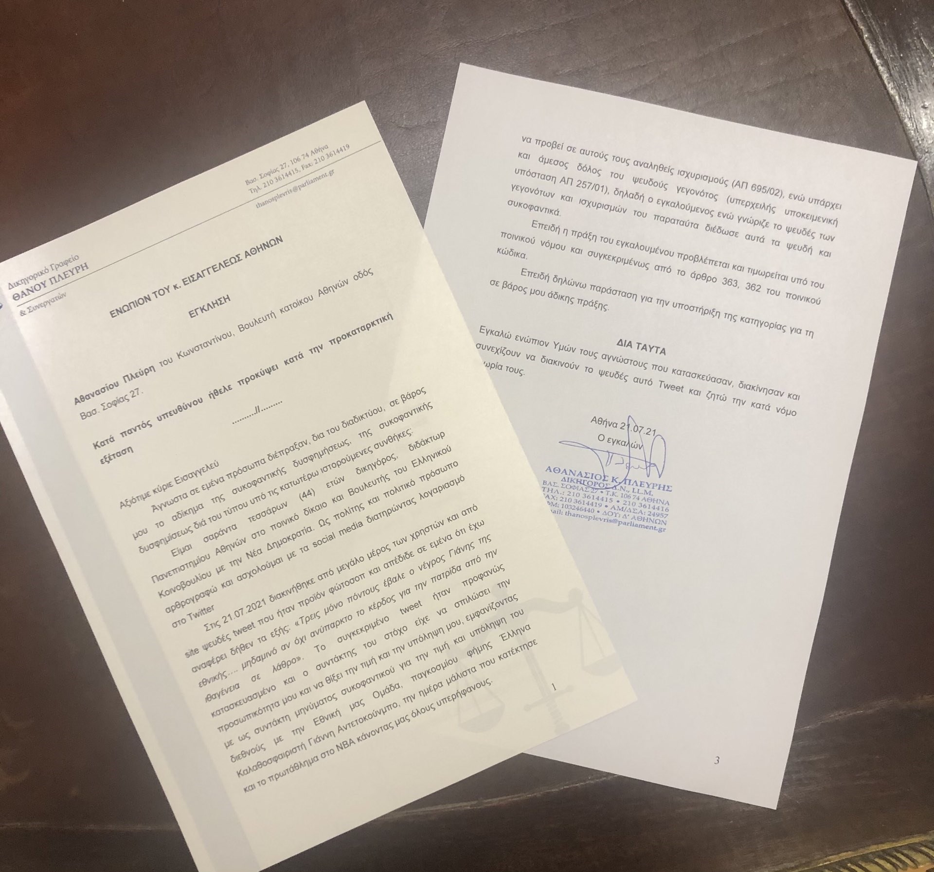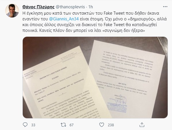 Κινείται δικαστικά για tweet που κυκλοφορεί στο διαδίκτυο και τον παρουσιάζει να υβρίζει τον Γιάννη Αντετοκούνμπο ο βουλευτής της ΝΔ, Θάνος Πλεύρης. «Η έγκληση μου κατά των συντακτών του Fake Tweet που δήθεν έκανα εναντίον του @Giannis_An34 είναι έτοιμη. Όχι μόνο ο «δημιουργός», αλλά και όποιος άλλος συνεχίζει να διακινεί το Fake Tweet θα καταδιωχθεί ποινικά. Κανείς πλέον δεν μπορεί να λέει «συγνώμη δεν ήξερα», αναφέρει στην ανάρτησή του στον λογαριασμό του στο Twitter ο κ. Πλεύρης.