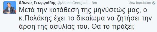 «Μετά την κατάθεση της μηνύσεώς μας, ο κ. Πολάκης έχει το δικαίωμα να ζητήσει την άρση της ασυλίας του. Θα το πράξει;» έγραψε ο αντιπρόεδρος της ΝΔ στο twitter.