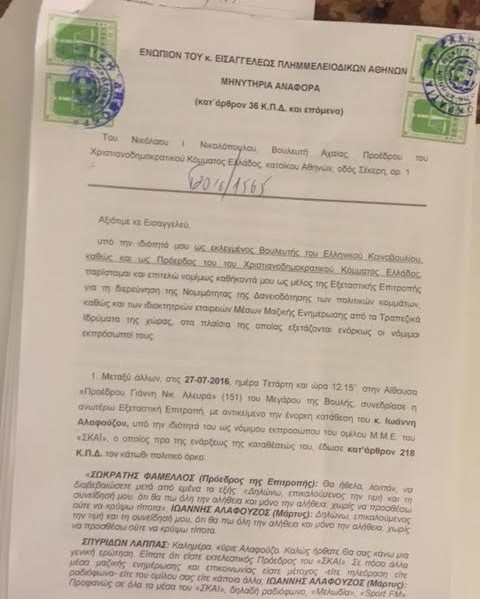 Μηνυτήρια αναφορά κατά του ιδιοκτήτη του ΣΚΑΪ, Γιάννη Αλαφούζου κατέθεσε ο ανεξάρτητος βουλευτής Αχαΐας και πρόεδρος του Χριστιανοδημοκρατικού Κόμματος Ελλάδος Νίκος Νικολόπουλος.