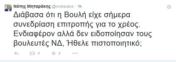 Τη διαδικασία συγκρότησης της Επιτροπής του Κοινοβουλίου, που θα διερευνήσει τις αιτίες της δημιουργίας και της διόγκωσης του Δημόσιου Χρέους, σχολίασε ο βουλευτής της Νέας Δημοκρατίας, Νότης Μηταράκης, μέσω του προσωπικού του λογαριασμού στο Twitter, επισημαίνοντας ότι οι βουλευτές της Νέας Δημοκρατίας, δεν ειδοποιήθηκαν. Αναλυτικά έγραψε: «Διάβασα ότι η Βουλή είχε σήμερα συνεδρίαση επιτροπής για το χρέος. Ενδιαφέρον αλλά δεν ειδοποίησαν τους βουλευτές ΝΔ, Ήθελε πιστοποιητικό;».