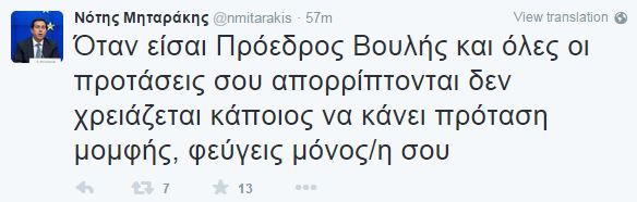 Ένα αιχμηρό σχόλιο για την Πρόεδρο της Βουλής, Ζωή Κωνσταντοπούλου, ανήρτησε στον προσωπικό του λογαριασμό στο Twitter, ο βουλευτής της Νέας Δημοκρατίας, Νότης Μηταράκης. Συγκεκριμένα, έγραψε: «Όταν είσαι Πρόεδρος της Βουλής και όλες οι προτάσεις σου απορρίπτονται δεν χρειάζεται κάποιος να κάνει πρόταση μομφής, φεύγεις μόνος/η σου».