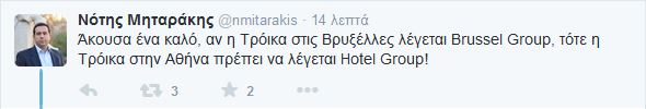 Την «εγκατάσταση» των τεχνικών κλιμακίων από τις Βρυξέλες σε κεντρικό ξενοδοχείο της Αθήνας σχολίασε μέσω του προσωπικού του λογαριασμού στο Twitter, ο βουλευτής της Νέας Δημοκρατίας, Νότης Μηταράκης. Συγκεκριμένα έγραψε: «Άκουσα ένα καλό, αν η Τρόικα στις Βρυξέλλες λέγεται Brussel Group, τότε η Τρόικα στην Αθήνα πρέπει να λέγεται Hotel Group!».
