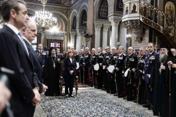 Με λαμπρότητα και παρουσία της Προέδρου της Δημοκρατίας Κατερίνας Σακελλαροπούλου και του πρωθυπουργού Κυριάκου Μητσοτάκη, τελέστηκε σήμερα (01/01) το πρωί, στον Μητροπολιτικό Ναό Αθηνών, η καθιερωμένη πανηγυρική Δοξολογία με αφορμή την έναρξη της νέας ημερολογιακής χρονιάς, χοροστατούντος του Αρχιεπισκόπου Αθηνών και πάσης Ελλάδος Ιερώνυμο.