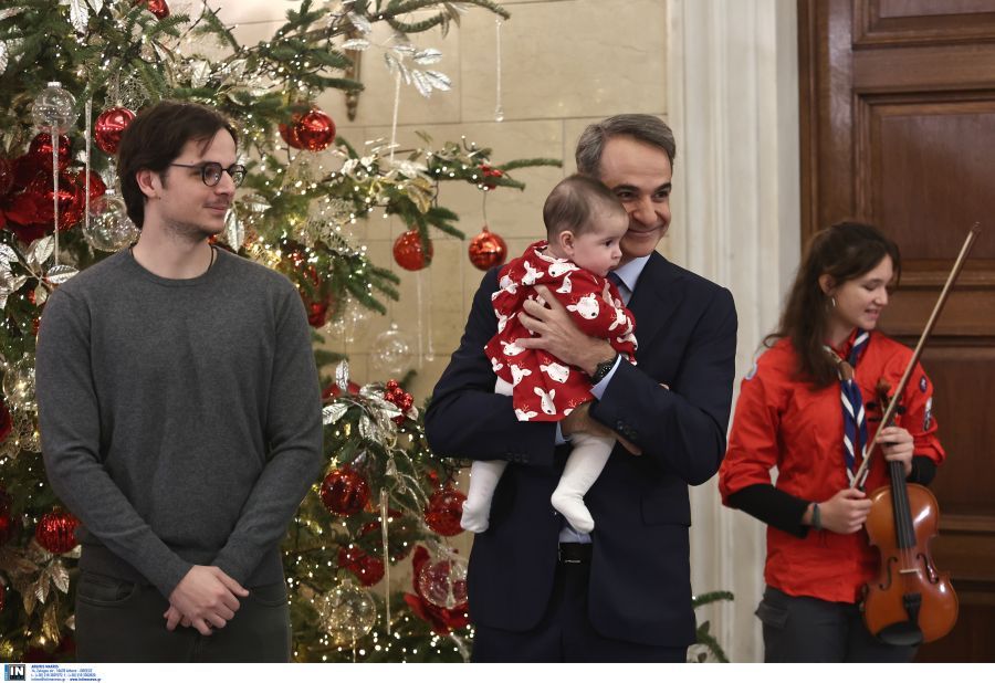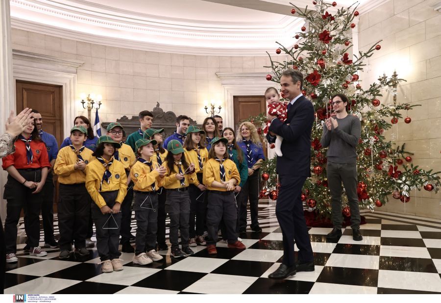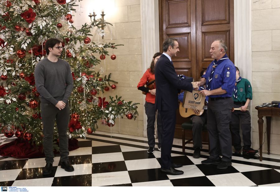 Τα κάλαντα της Πρωτοχρονιάς έψαλλαν στον πρωθυπουργό, Κυριάκο Μητσοτάκη, μέλη του Σώματος Ελλήνων Προσκόπων.