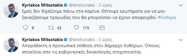 “Απαράδεκτη η προσωπική επίθεση στον δήμαρχο Κυθήρων” σχολιάζει σε ανάρτηση στον προσωπικό του λογαριασμό στο twitter, o πρόεδρος της ΝΔ, Κυριάκος Μητσοτάκης και προσθέτει: “Όποιος αποκλίνει από τις κυβερνητικές δικαιολογίες στοχοποιείται”.