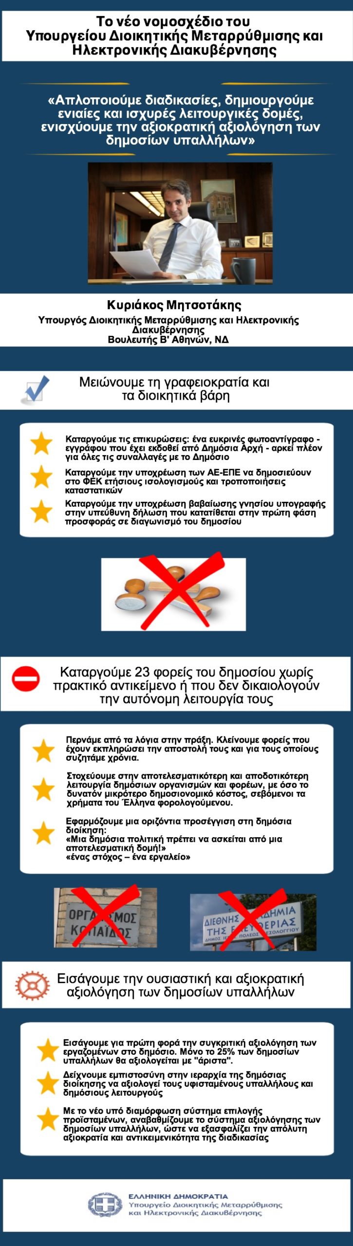 Στη Βουλή κατατέθηκε το σχέδιο νόμου του Υπουργείου Διοικητικής Μεταρρύθμισης και Ηλεκτρονικής Διακυβέρνησης που όπως αναφέρεται στο δελτίο τύπου στοχεύει σε απλουστεύεις με σκοπό τη μείωση της γραφειοκρατίας για πολίτες και επιχειρήσεις, τον εξορθολογισμό των δομών του Δημοσίου με κατάργηση 23 φορέων, καθώς και αξιολόγηση των δημοσίων υπαλλήλων.