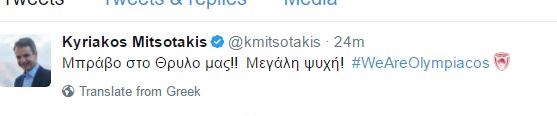 “Μπράβο στο θρύλο μας!! Μεγάλη ψυχή!! #weareolympiacos” έγραψε στο λογαριασμό του ο πρόεδρος της ΝΔ.