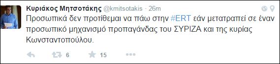“Προσωπικά δεν προτίθεμαι να πάω στην ΕΡΤ εάν μετατραπεί σε έναν προσωπικό μηχανισμό προπαγάνδας του ΣΥΡΙΖΑ και της κυρίας Κωνσταντοπούλου” έγραψε ο κοινοβουλευτικός εκπρόσωπος της ΝΔ.
