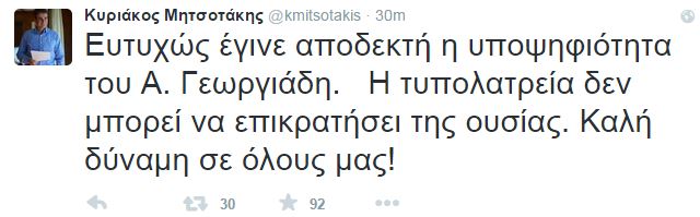 “Ευτυχώς έγινε αποδεκτή η υποψηφιότητα του Α. Γεωργιάδη. Η τυπολατρία δεν μπορεί να επικρατήσει της ουσίας. Καλή δύναμη σε όλους μας”