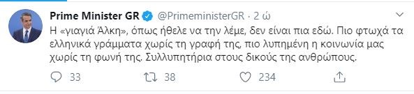 «”Η γιαγιά Άλκη”, όπως ήθελε να τη λέμε, δεν είναι πια εδώ. Πιο φτωχά τα ελληνικά γράμματα χωρίς τη γραφή της, πιο λυπημένη η κοινωνία μας χωρίς τη φωνή της. Συλλυπητήρια στους δικούς της ανθρώπους», έγραψε σε ανάρτησή του ο Πρωθυπουργός.