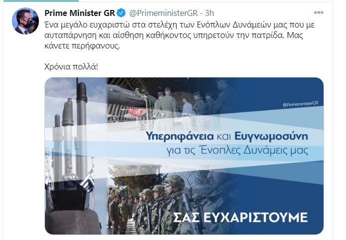 Με ανάρτησή του στο twitter και με αφορμή τη σημερινή ημέρα γιορτής των Ενόπλων Δυνάμεων, ο Πρωθυπουργός Κυριάκος Μητσοτάκης ευχαρίστησε τα στελέχη των Ενόπλων Δυνάμεων γράφοντας: «Ένα μεγάλο ευχαριστώ στα στελέχη των Ενόπλων Δυνάμεών μας που με αυταπάρνηση και αίσθηση καθήκοντος υπηρετούν την πατρίδα. Μας κάνετε περήφανους. Χρόνια πολλά!» ανέφερε ο Πρωθυπουργός.