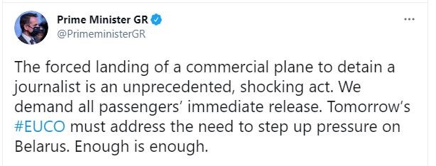 Όπως έγραψε σε ανάρτησή του ο Πρωθυπουργός: “Η αναγκαστική προσγείωση εμπορικής πτήσης για τη σύλληψη ενός δημοσιογράφου είναι μία άνευ προηγουμένου, σοκαριστική ενέργεια. Απαιτούμε την άμεση απελευθέρωση όλων των επιβατών. Αύριο στη Σύνοδο Κορυφής πρέπει να εκφραστεί η ανάγκη για αύξηση της πίεσης στη Λευκορωσία. Φθάνει!”