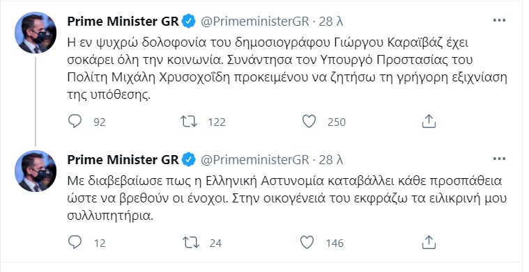 Με διαβεβαίωσε πως η Ελληνική Αστυνομία καταβάλλει κάθε προσπάθεια ώστε να βρεθούν οι ένοχοι. Στην οικογένειά του εκφράζω τα ειλικρινή μου συλλυπητήρια” έγραψε ο Πρωθυπουργός Κυριάκος Μητσοτάκης στο Τwitter.