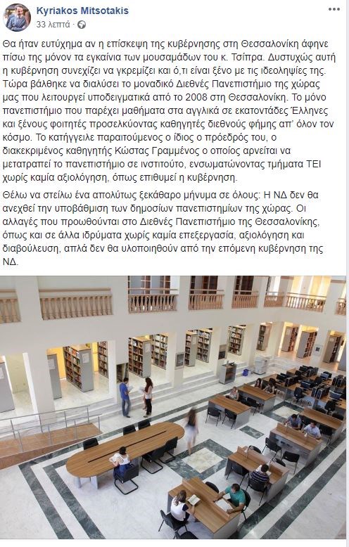Θέλω να στείλω ένα απολύτως ξεκάθαρο μήνυμα σε όλους: Η ΝΔ δεν θα ανεχθεί την υποβάθμιση των δημοσίων πανεπιστημίων της χώρας. Οι αλλαγές που προωθούνται στο Διεθνές Πανεπιστήμιο της Θεσσαλονίκης, όπως και σε άλλα ιδρύματα χωρίς καμία επεξεργασία, αξιολόγηση και διαβούλευση, απλά δεν θα υλοποιηθούν από την επόμενη κυβέρνηση της ΝΔ.