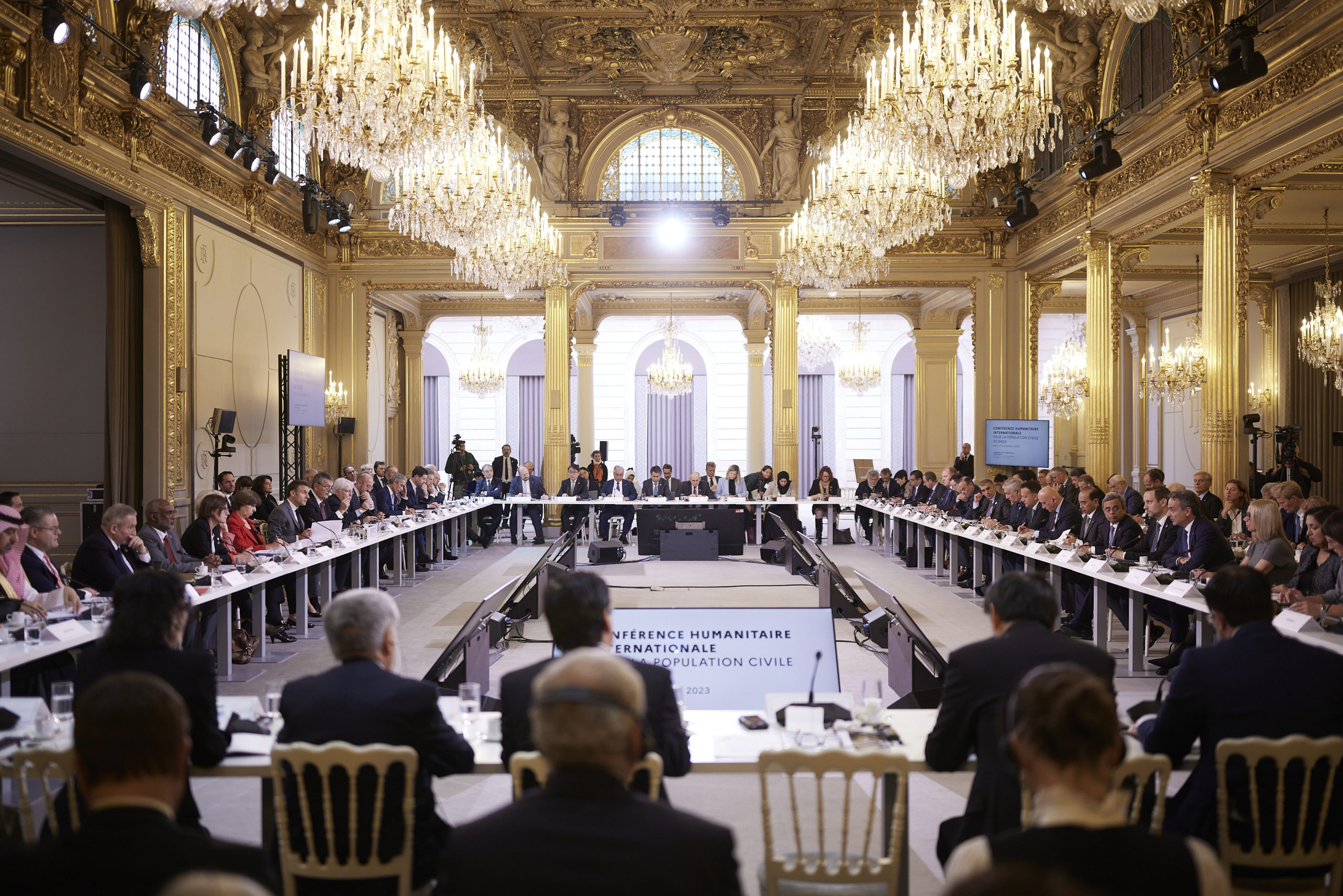 «Επιτρέψτε μου καταρχάς να ευχαριστήσω τον Πρόεδρο Μακρόν για τη διοργάνωση της σημερινής διάσκεψης, η οποία δυστυχώς πραγματοποιείται με φόντο την κλιμακούμενη ανθρωπιστική κρίση στην περιοχή. Εκφράζουμε τη βαθιά θλίψη μας για την απώλεια αθώων πολιτών. Οι πρώτες μας σκέψεις είναι με τις οικογένειες των θυμάτων καθώς και με τις οικογένειες των ομήρων. Και, βέβαια, ανησυχούμε βαθύτατα για την κλιμάκωση στο πεδίο τις τελευταίες ημέρες.