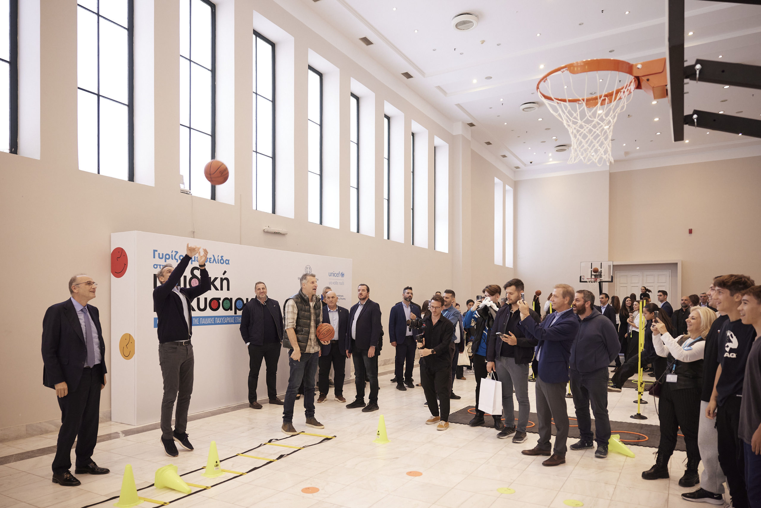 Ο Κυριάκος Μητσοτάκης παρακολούθησε, επίσης, αθλητικές δραστηριότητες για παιδιά σε ειδικά διαμορφωμένο χώρο στον εσωτερικό κήπο του Ζαππείου, είχε την ευκαιρία να συνομιλήσει με νεαρούς αθλητές και δοκίμασε σουτ μαζί με τον πρώην διεθνή μπασκετμπολίστα Θοδωρή Παπαλουκά.