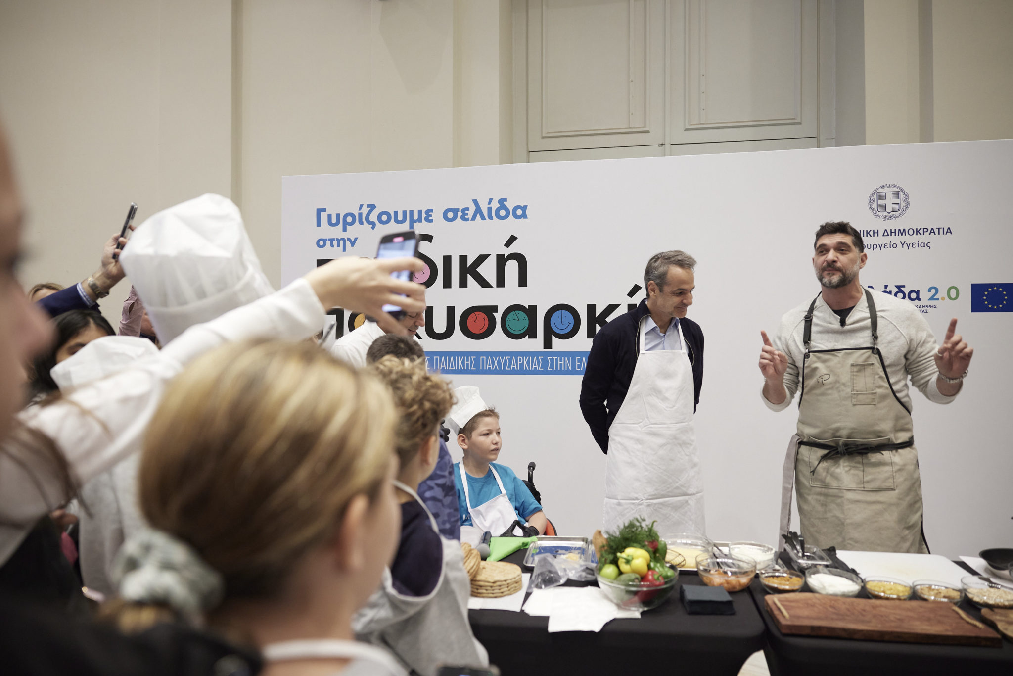 Ο Πρωθυπουργός, Κυριάκος Μητσοτάκης, παρέστη σήμερα στην εκδήλωση για την παρουσίαση του προγράμματος «Εθνική Δράση κατά της Παιδικής Παχυσαρκίας στην Ελλάδα», στο Ζάππειο. Με την βοήθεια και υπό την καθοδήγηση του σεφ Πάνου Ιωαννίδη, ο Κυριάκος Μητσοτάκης και η Αναπληρώτρια Υπουργός Υγείας, Ειρήνη Αγαπηδάκη, ετοίμασαν μία υγιεινή παραλλαγή του παραδοσιακού γύρου με πίτα. Ο σεφ Ιωαννίδης έδειξε πώς, με απλά, υγιεινά υλικά και συστατικά είναι δυνατόν να ετοιμάσουμε γευστικές συνταγές.