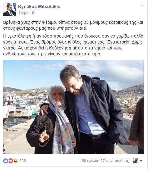 Μόλις μία μέρα μετά την επίσκεψή του στην Ψέριμο, ο πρόεδρος της ΝΔ, σε ανάρτησή του στο προφίλ του στο Facebook, ανέβασε μία φωτογραφία με τη γιαγιά του νησιού και αναφέρθηκε στους 35 μόνιμους κατοίκους και τους φαντάρους που υπηρετούν εκεί.