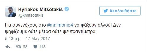 «Για συνενόχους στο #mnimonio4 να ψάξουν αλλού! Δεν ψηφίζουμε ούτε μέτρα ούτε ψευτοαντίμετρα».