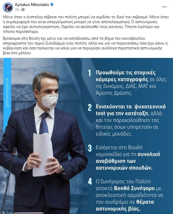 «Μόνο όταν ο ένστολος σέβεται τον πολίτη μπορεί να κερδίσει τον δικό του σεβασμό. Μόνο όταν η συμπεριφορά του είναι επαγγελματική μπορεί να γίνει αποτελεσματική. Ο αστυνομικός οφείλει να έχει αυτοσυγκράτηση. Οφείλει να ακολουθεί τους κανόνες. Τίποτα λιγότερο και τίποτα περισσότερο» αναφέρει σε ανάρτησή του στο facebook ο πρωθυπουργός Κυριάκος Μητσοτάκης και υπογραμμίζει: