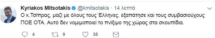 Επίθεση στον πρωθυπουργό για το θέμα που έχει προκύψει με τους συμβασιούχους ΠΟΕ ΟΤΑ εξαπέλυσε με ένα αιχμηρό tweet ο πρόεδρος της ΝΔ, Κυριάκος Μητσοτάκης.«Ο κ. Τσίπρας, μαζί με όλους τους Έλληνες, εξαπάτησε και τους συμβασιούχους ΠΟΕ ΟΤΑ. Αυτό δεν νομιμοποιεί το πνίξιμο της χώρας στα σκουπίδια», έγραψε στον προσωπικό του λογαριασμό του στο Twitter ο Κυριάκος Μητσοτάκης.