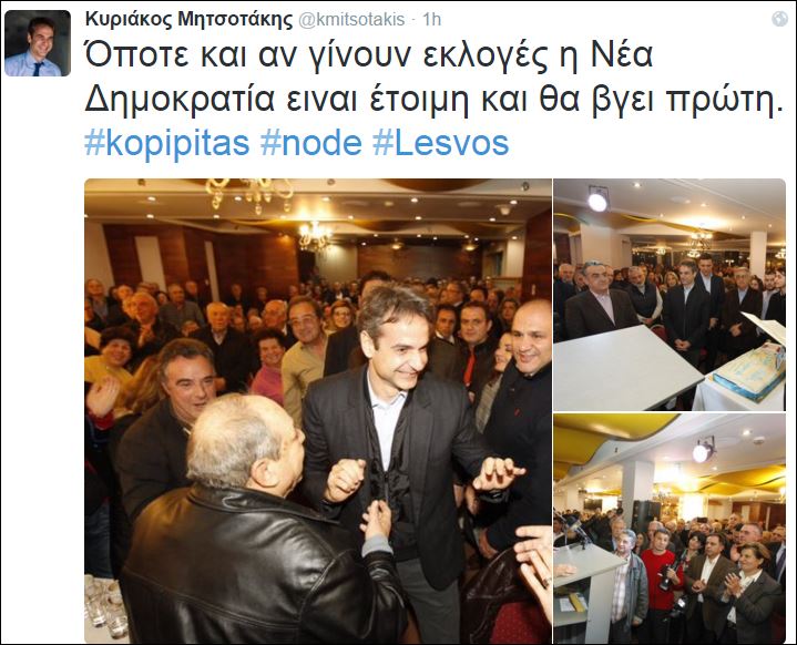 «Όποτε και αν γίνουν εκλογές η Νέα Δημοκρατία είναι έτοιμη και θα βγει πρώτη» έγραψε ο πρόεδρος της Νέας Δημοκρατίας, στον προσωπικό του λογαριασμό στο twitter.