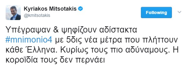 Υπέγραψαν και ψηφίζουν αδίστακτα μνημόνιο 4, με 5 δισ. νέα μέτρα που πλήττουν κάθε Έλληνα. Κυρίως τους πιο αδύναμους. Η κοροϊδία τους δεν περνάει, αναφέρει ο πρόεδρος της Νέας Δημοκρατίας Κυριάκος Μητσοτάκης με ανάρτησή του στο twitter.