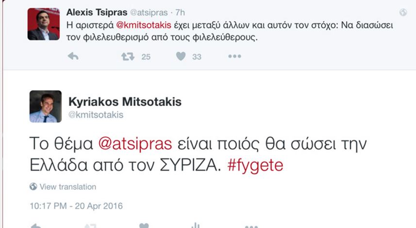 Λίγες ώρες αργότερα, λοιπόν, ο κ. Μητσοτάκης έσπευσε από τον δικό του λογαριασμό, να ανταποδώσει τη βολή, γράφοντας: «Το θέμα, κύριε Τσίπρα είναι ποιος θα σώσει την Ελλάδα από τον ΣΥΡΙΖΑ», προσθέτοντας το hastag #fygete, που είναι το μότο το οποίο χρησιμοποιεί σε όλες του τις τελευταίες ομιλίες ο αρχηγός της αξιωματικής αντιπολίτευσης.