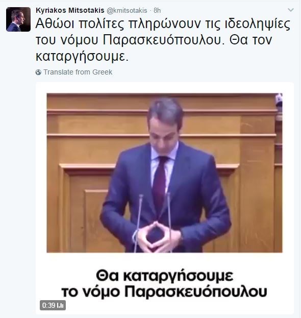 Στην κατάργηση του νόμου Παρασκευόπουλου επανήλθε ο πρόεδρος της ΝΔ, Κυριάκος Μητσοτάκης, με αφορμή το χθεσινό περιστατικό στο Παλαιό Φάληρο.«Αθώοι πολίτες πληρώνουν τις ιδεοληψίες του νόμου Παρασκευόπουλου, θα τον καταργήσουμε», αναφέρει σε tweet, ο πρόεδρος της ΝΔ.Παραθέτει μάλιστα βίντεο με παλαιότερες δηλώσεις του στην Βουλή, με τις οποίες κατηγορούσε τον τότε υπουργό Δικαιοσύνης ότι η πρώτη ενέργεια ήταν «η ικανοποίηση των αιτημάτων των φυλακισμένων τρομοκρατών». Επίσης, απόσπασμα από συνέντευξή του στον ALPHA στην οποία αναφέρει απαντώντας σε σχετική ερώτηση: «Βεβαίως θα καταργηθεί ο νόμος Παρασκευόπουλου και βεβαίως θα φτιαχτεί μία φυλακή υψίστης ασφαλείας… Δεν μπορούμε να δίνουμε την εντύπωση ότι με χαριστικές διατάξεις αποφυλακίζονται τρομοκράτες».