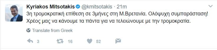“3η τρομοκρατική επίθεση σε 3μήνες στη Μ. Βρετανία. Ολόψυχη συμπαράσταση! Χρέος μας να κάνουμε τα πάντα για να τελειώνουμε με την τρομοκρατία”, γράφει ο Πρόεδρος της ΝΔ.