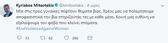 «Μία στις τρεις γυναίκες πέφτουν θύματα βίας. Χρέος μας να πολεμήσουμε αποφασιστικά την βία στηρίζοντάς τες με κάθε μέσο. Κοινή μας ευθύνη να εξαλείψουμε τον φόβο που κλείνει στόματα», ανέφερε χαρακτηριστικά στο tweet του ο πρόεδρος της Αξιωματικής Αντιπολίτευσης.