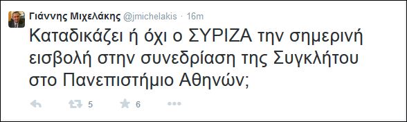 Να πάρει θέση για τα σημερινά επεισόδια στη συνεδρίαση της συγκλήτου του πανεπιστημίου Αθηνών καλεί τον ΣΥΡΙΖΑ ο Γιάννης Μιχελάκης με ανάρτηση στον προσωπικό του λογαριασμό στο Twitter.