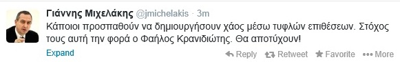 Ο υπουργός Εσωτερικών, Γιάννης Μιχελάκης, σχολίασε την επίθεση στο γραφείο του Φαήλου Κρανιδιώτη στο twitter: