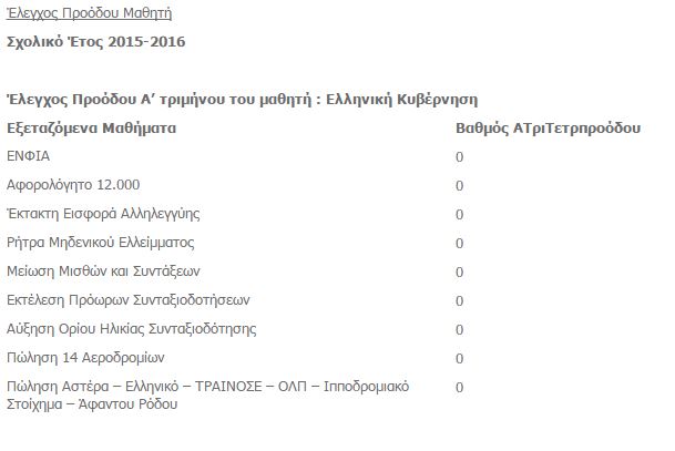 Με τον έλεγχο προόδου που παρουσίασε ο βουλευτής του ΣΥΡΙΖΑ, Γιάννης Μιχελογιαννάκης σε τηλεοπτική εκπομπή, με… μαθητή την Ελληνική Κυβέρνηση, υπογράφοντα διευθυντή του σχολείου τους θεσμούς και υπογράφοντα κηδεμόνα τον Ελληνικό Λαό, όπου η βαθμολογία του μαθητή είναι «μηδέν».