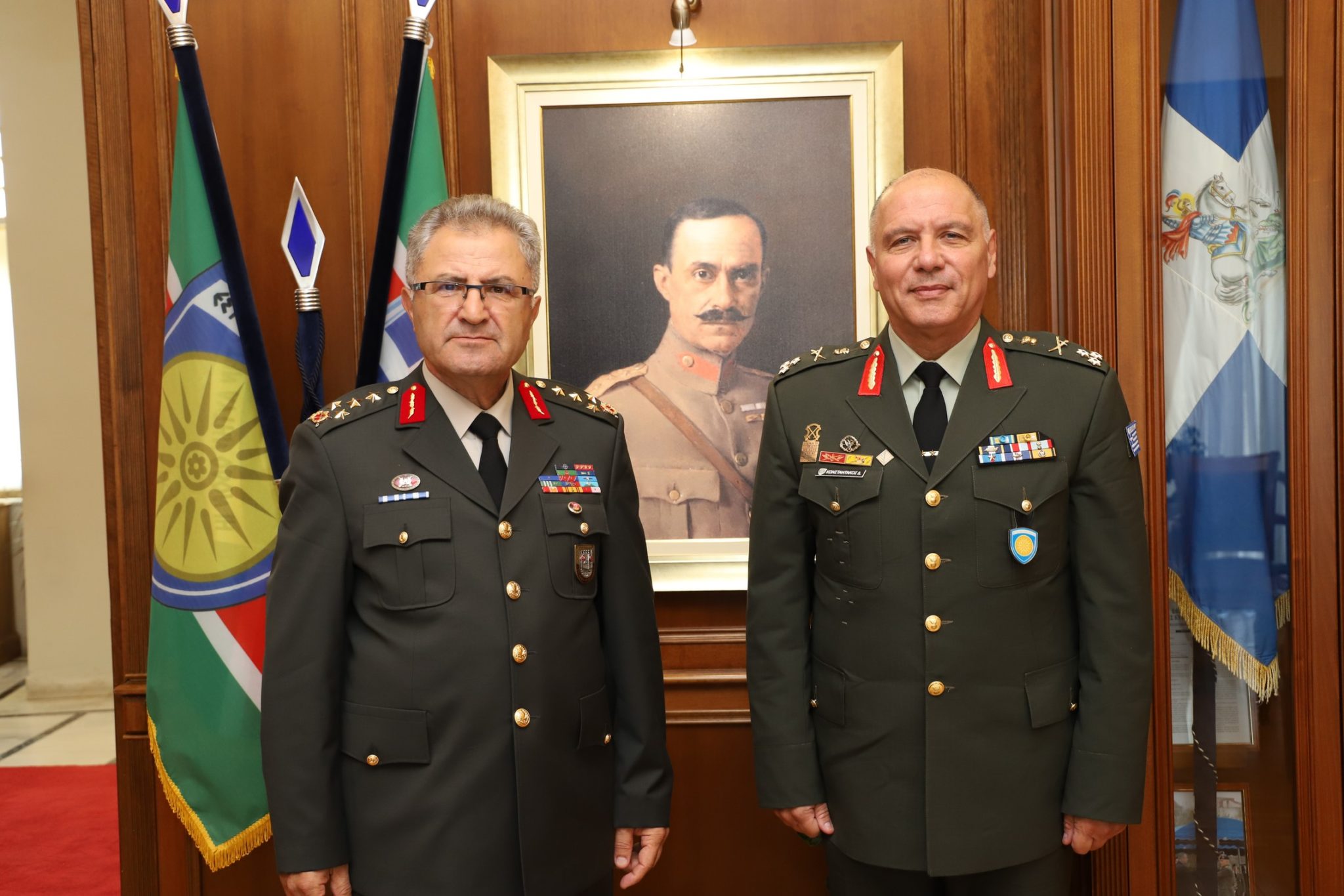 Μπροστά στον πίνακα που απεικονίζει τον Νικόλαο Πλαστήρα να ηγείται της Μικρασιατικής Εκστρατείας και της απελευθέρωσης της Σμύρνης, ο Διοικητής της 1ης Στρατιάς Τουρκίας με έδρα την Κωνσταντινούπολη, Στρατηγός Metin Tokel φωτογραφήθηκε με τον Διοικητή της 1ης Στρατιάς/EU-OHQ «ΑΧΙΛΛΕΑΣ» Αντιστράτηγο Δημόκριτο Κωνσταντάκο, στην Λάρισα. Εκεί όπου το διάστημα από 11 έως 12 Σεπτεμβρίου 2024, στο πλαίσιο των Μέτρων Οικοδόμησης Εμπιστοσύνης μεταξύ Ελλάδας και Τουρκίας.