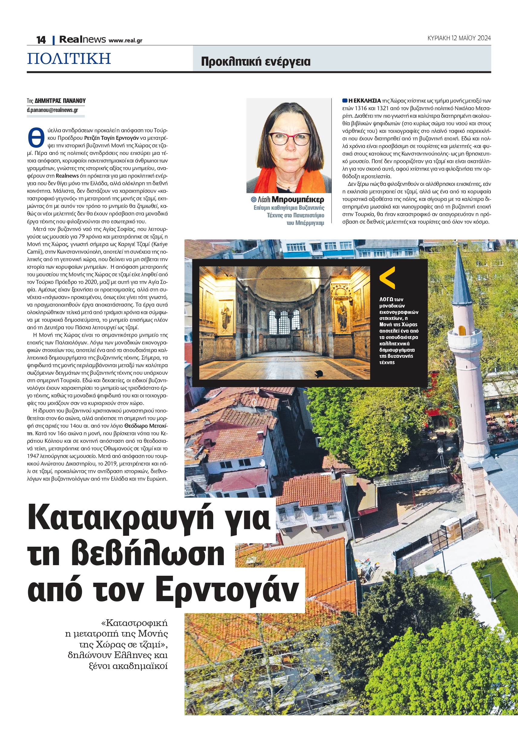 Θύελλα αντιδράσεων προκαλεί η απόφαση του Τούρκου Προέδρου Ρετζέπ Ταγίπ Ερντογάν να μετατρέψει την ιστορική βυζαντινή Μονή της Χώρας σε τζαμί. Πέρα από τις πολιτικές αντιδράσεις που επισύρει μια τέτοια απόφαση, κορυφαίοι πανεπιστημιακοί και άνθρωποι των γραμμάτων, γνώστες της ιστορικής αξίας του μνημείου, αναφέρουν στη Realnews ότι πρόκειται για μια προκλητική ενέργεια που δεν θίγει μόνο την Ελλάδα, αλλά ολόκληρη τη διεθνή κοινότητα.