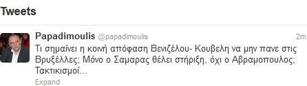 Πριν από λίγο ο Δημήτρης Παπαδημούλης σχολίασε με αιχμηρό τρόπο στο Twitter την απόφαση των Ευάγγελου Βενιζέλου και Φώτη Κουβέλη να μην μεταβούν στις Βρυξέλλες λόγω του προβλήματος υγείας του Αντώνη Σαμαρά.”Τι σημαίνει η κοινή απόφαση Βενιζέλου- Κουβέλη να μην πάνε στις Βρυξέλλες; Μόνο ο Σαμαράς θέλει στήριξη, όχι ο Αβραμόπουλος; Τακτικισμοί…”, ήταν το σχόλιο του βουλευτή του ΣΥΡΙΖΑ.