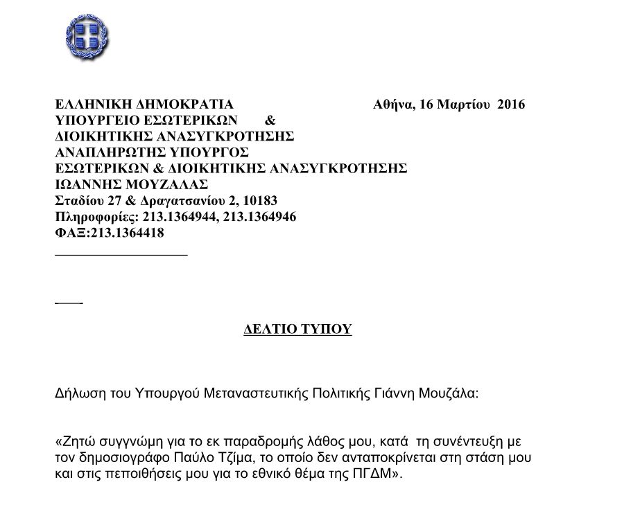 «Ζητώ συγγνώμη για το εκ παραδρομής λάθος μου, κατά τη συνέντευξη με τον δημοσιογράφο Παύλο Τζίμα, το οποίο δεν ανταποκρίνεται στη στάση μου και στις πεποιθήσεις μου για το εθνικό θέμα της ΠΓΔΜ».