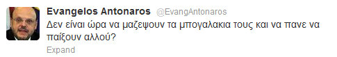 Αιχμηρός για άλλη μια φορά ο Ευάγγελος Αντώναρος, ο οποίος με ανάρτησή του στο tweeter είπε -προφανώς- για τους συνεργάτες του Αντώνη Σαμαρά: «Δεν είναι ώρα να μαζεψουν τα μπογαλακια τους και να πανε να παίξουν αλλού;».