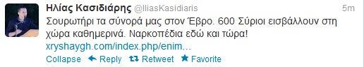 Ναρκοπέδια ζητάει στα σύνορα μέσω του twitter ο βουλευτής της Χρυσής Αυγής, Ηλίας Κασιδιάρης.ΔΙΑΒΑΣΤΕ ΤΟ tweet