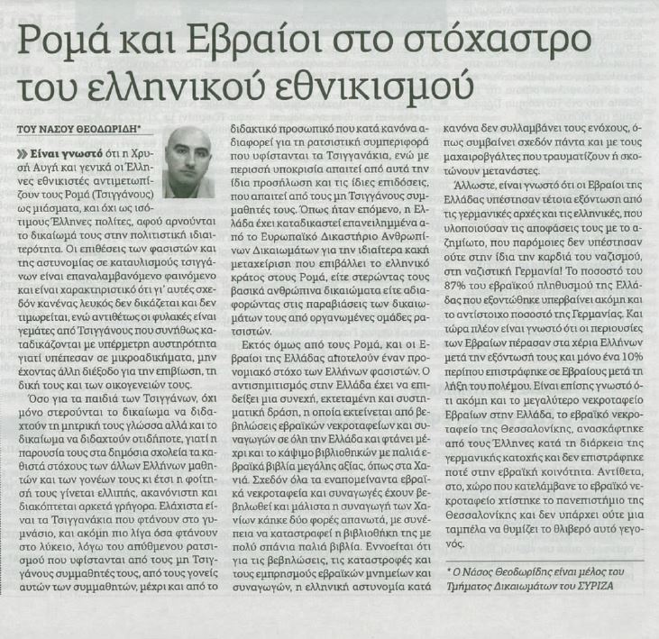 Παρόλα αυτά, υπογραμμίζει, “ο κ. Θεοδωρίδης συνεχίζει να αρθρογραφεί στην κομματική εφημερίδα του ΣΥΡΙΖΑ Αυγή με το ίδιο πάθος τις “προσωπικές” του απόψεις υπογράφοντας μάλιστα με την ιδιότητα, η οποία του έχει δήθεν στερηθεί από τον αρχηγό και φίλο του Αλέξη Τσίπρα, ο οποίος τον διόρισε στην Επιτροπή Ανθρωπίνων Δικαιωμάτων με προσωπική του υπογραφή”.