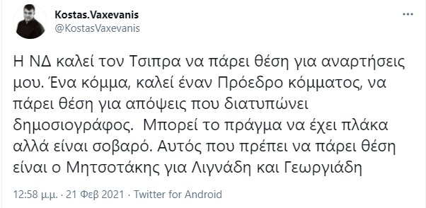 “Η ΝΔ καλεί τον Τσιπρα να πάρει θέση για αναρτήσεις μου. Ένα κόμμα, καλεί έναν Πρόεδρο κόμματος, να πάρει θέση για απόψεις που διατυπώνει δημοσιογράφος. Μπορεί το πράγμα να έχει πλάκα αλλά είναι σοβαρό. Αυτός που πρέπει να πάρει θέση είναι ο Μητσοτάκης για Λιγνάδη και Γεωργιάδη” αναφέρει ο δημοσιογράφος.