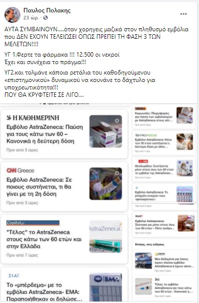 Συγκεκριμένα, ο πρώην αναπληρωτής υπουργός Υγείας ανέφερε σε post του: “ΑΥΤΑ ΣΥΜΒΑΙΝΟΥΝ…..όταν χορηγεις μαζικά στον πληθυσμό εμβόλια που ΔΕΝ ΕΧΟΥΝ ΤΕΛΕΙΩΣΕΙ ΟΠΩΣ ΠΡΕΠΕΙ ΤΗ ΦΑΣΗ 3 ΤΩΝ ΜΕΛΕΤΩΝ!!!! ΥΓ 1.Φερτε τα φάρμακα !!! 12.500 οι νεκροί Έχει και συνέχεια το πράγμα!!! ΥΓ2.και τολμάνε κάποια ρετάλια του καθοδηγούμενου «επιστημονικού» δυναμικού να κουνάνε το δάχτυλο για υποχρεωτικότητα!!! ΠΟΥ ΘΑ ΚΡΥΦΤΕΙΤΕ ΣΕ ΛΙΓΟ….”.