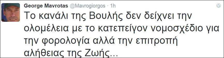 «Το κανάλι της Βουλής δεν δείχνει την ολομέλεια με το κατεπείγον νομοσχέδιο για την φορολογία αλλά την επιτροπή αλήθειας της Ζωής…», έγραψε ο κ. Μαυρωτάς.