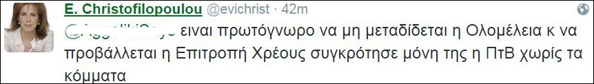 «Είναι πρωτόγνωρο να μη μεταδίδεται η Ολομέλεια κ να προβάλλεται η Επιτροπή Χρέους συγκρότησε μόνη της η ΠτΒ χωρίς τα κόμματα», έγραψε στο twitter και η βουλευτής του ΠΑΣΟΚ, Εύη Χριστοφιλοπούλου.