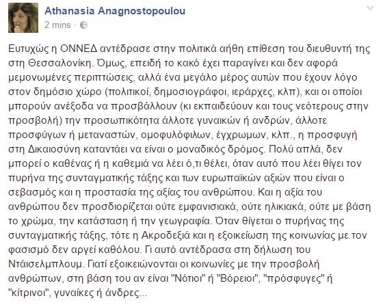 Με νέα ανάρτησή της στο Facebook, η βουλευτής του ΣΥΡΙΖΑ και πρώην υπουργός, Σία Αναγνωστοπούλου αναφέρεται στην σεξιστική επίθεση που δέχτηκε από τον διευθυντή της ΟΝΝΕΔ Θεσσαλονίκης, Εμμανουήλ Κούλα.«Ευτυχώς η ΟΝΝΕΔ αντέδρασε στην πολιτικά αήθη επίθεση του διευθυντή της στη Θεσσαλονίκη» επισημαίνει η κ. Αναγνωστοπούλου.Η βουλευτής του ΣΥΡΙΖΑ προσθέτει ωστόσο: «Όμως, επειδή το κακό έχει παραγίνει και δεν αφορά μεμονωμένες περιπτώσεις, αλλά ένα μεγάλο μέρος αυτών που έχουν λόγο στον δημόσιο χώρο (πολιτικοί, δημοσιογράφοι, ιεράρχες, κλπ), και οι οποίοι μπορούν ανέξοδα να προσβάλλουν (κι εκπαιδεύουν και τους νεότερους στην προσβολή) την προσωπικότητα άλλοτε γυναικών ή ανδρών, άλλοτε προσφύγων ή μεταναστών, ομοφυλόφιλων, έγχρωμων, κλπ., η προσφυγή στη Δικαιοσύνη καταντάει να είναι ο μοναδικός δρόμος».«Πολύ απλά, δεν μπορεί ο καθένας ή η καθεμιά να λέει ό,τι θέλει, όταν αυτό που λέει θίγει τον πυρήνα της συνταγματικής τάξης και των ευρωπαϊκών αξιών που είναι ο σεβασμός και η προστασία της αξίας του ανθρώπου. Και η αξία του ανθρώπου δεν προσδιορίζεται ούτε εμφανισιακά, ούτε ηλικιακά, ούτε με βάση το χρώμα, την κατάσταση ή την γεωγραφία» συνεχίζει η κ. Αναγνωστοπούλου. «Όταν θίγεται ο πυρήνας της συνταγματικής τάξης, τότε η Ακροδεξιά και η εξοικείωση της κοινωνίας με τον φασισμό δεν αργεί καθόλου. Γι αυτό αντέδρασα στη δήλωση του Ντάισελμπλουμ. Γιατί εξοικειώνονται οι κοινωνίες με την προσβολή ανθρώπων, στη βάση του αν είναι “Νότιοι” ή “Βόρειοι”, “πρόσφυγες” ή “κίτρινοι”, γυναίκες ή άνδρες…» καταλήγει.
