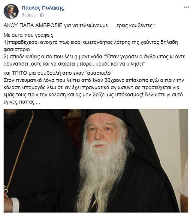 Ο Υπουργός Υγείας, Παύλος Πολάκης, δίνει συνέχεια στην κόντρα του με τον Μητροπολίτη Καλαβρύτων και Αιγιαλείας, κ. Αμβρόσιο. Μετά τη νέα ανάρτηση του Μητροπολίτη για τον Υπουργό, ο κ. Πολάκης θέλησε με μία ανάρτηση στον προσωπικό του λογαριασμό στο Facebook να δώσει την απάντησή του.