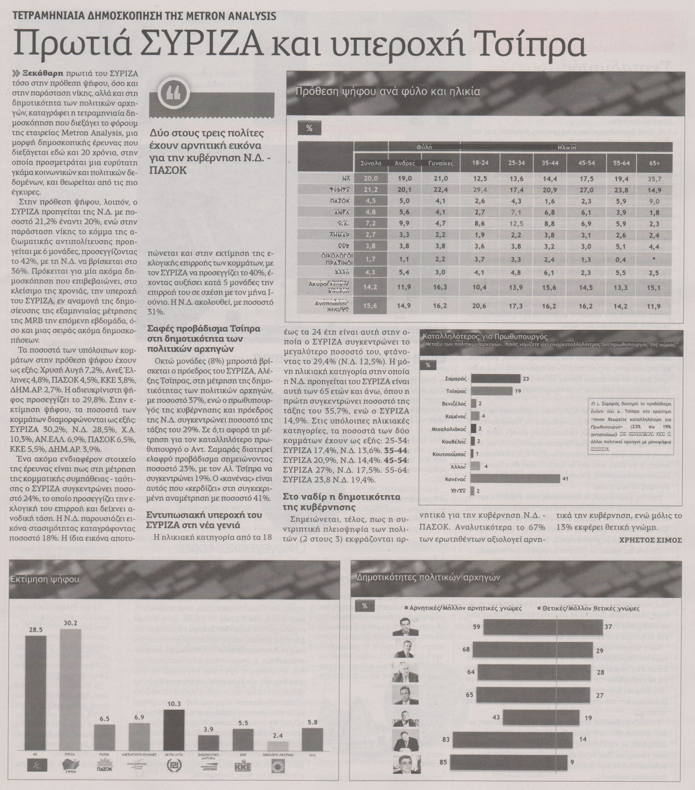 Πρώτο κόμμα με διαφορά 1,2% από τη ΝΔ εμφανίζεται ο ΣΥΡΙΖΑ σύμφωνα με δημοσκόπηση της Metron Analysis για λογαριασμό της εφημερίδας Αυγή.