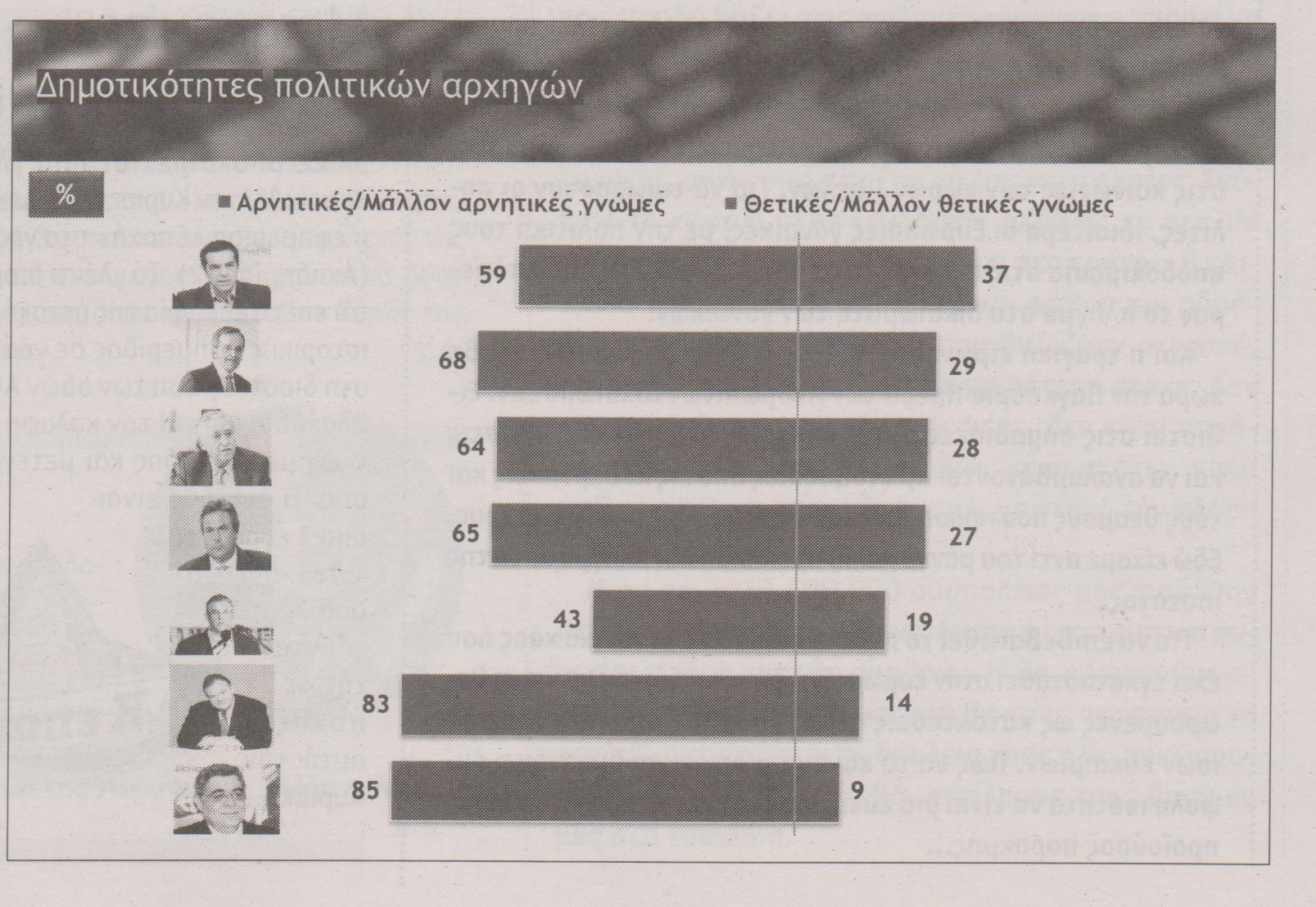 Σε ό,τι αφορά τα ποσοστά δημοτικότητας των πολιτικών αρχηγών ο Αλέξης Τσίπρας προηγείται με 37% στις θετικές ή μάλλον θετικές γνώμες, ακολουθεί ο Αντώνης Σαμαράς με 29%, ο Φώτης Κουβέλης με 28%, ο Πάνος Καμμένος με 27%, ο Δημήτρης Κουτσούμπας 19%, ο Ευάγγελος Βενιζέλος με 14 και ο Νίκος Μιχαλολιάκος με 9%.